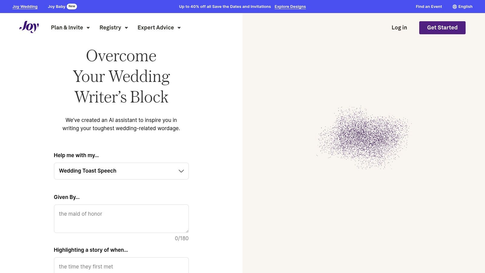 Joy is a comprehensive wedding planning platform best known for its beautifully designed wedding websites and guest management tools. It has carved out a unique space in the AI wedding planner landscape with its "Writer's Block" feature, an AI assistant specifically designed to tackle the communication aspects of wedding planning. This tool is a lifesaver for couples struggling to find the right words for their website, invitations, and guest messages.