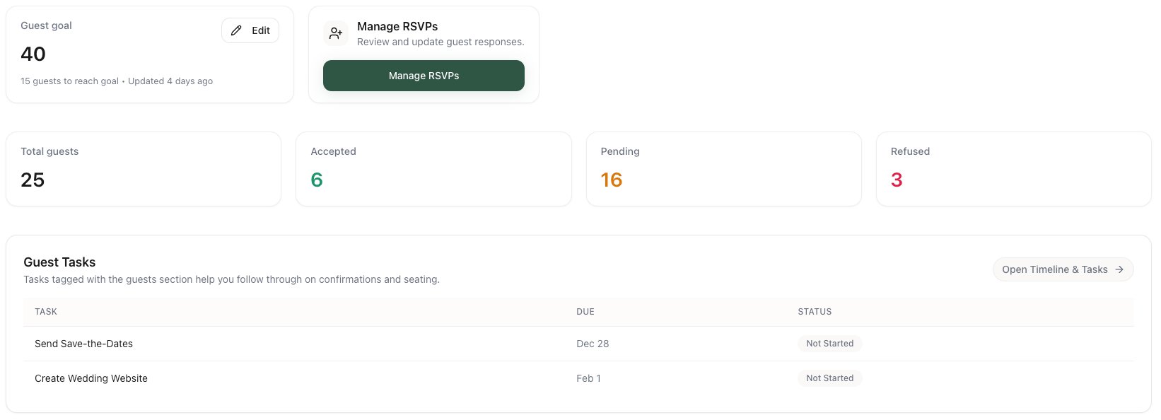 | Create Your Guest List & Manage RSVPs | Moderate–High — data collection and follow-ups | Medium: contact info platform, RSVP automation, reminders | Accurate headcount; dietary and seating clarity | Large weddings, blended families, destination events | High: centralizes responses; reduces manual tracking errors |